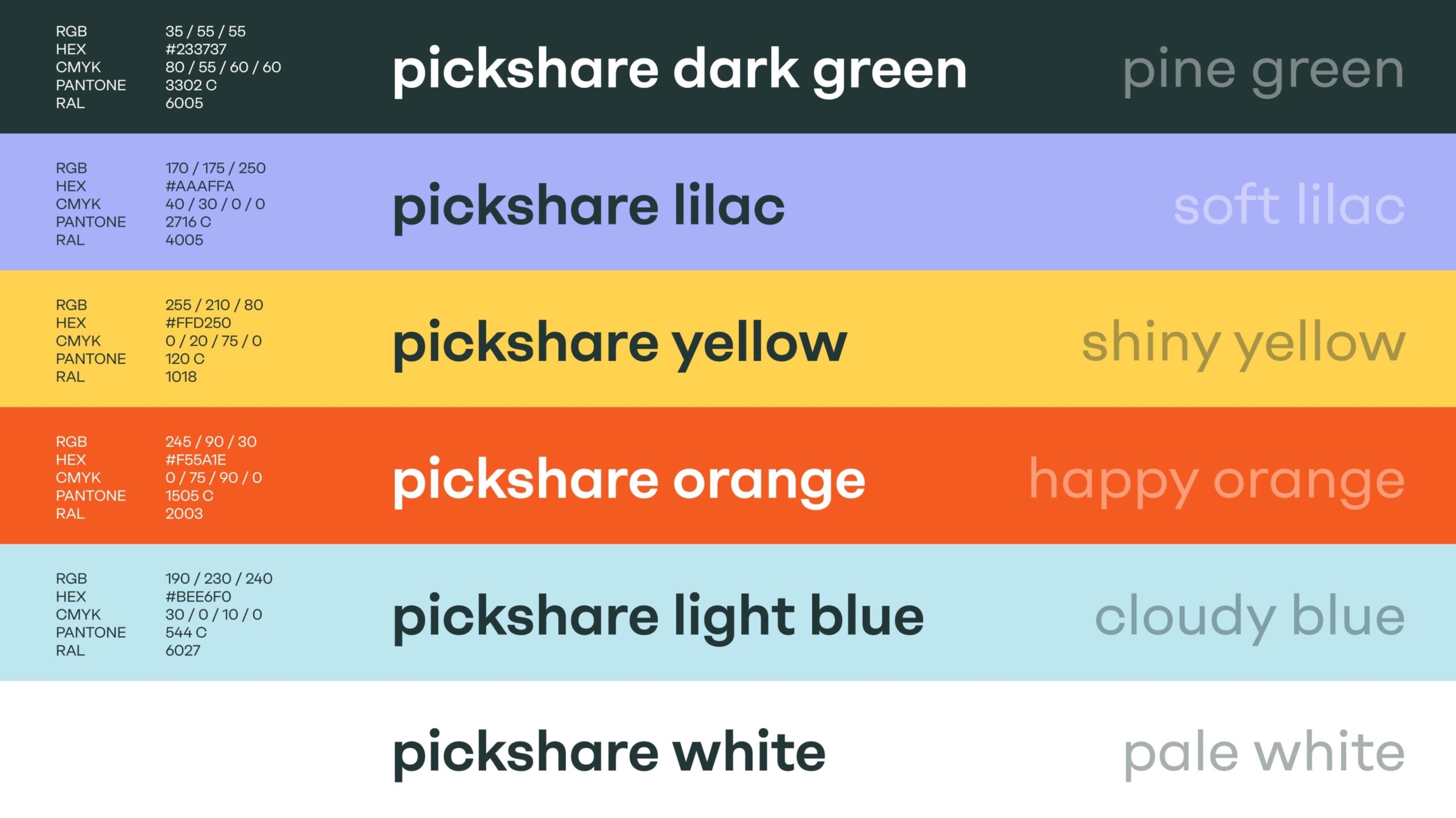 Die visuelle Welt von Pickshare ist klar und urban – mit einem starken Fokus auf Nachhaltigkeit und Technik. Pine Green dient als Grundton und Ruhepol – als tragende Fläche. Shiny Yellow und Happy Orange akzentuieren und lenken die Aufmerksamkeit auf das Wesentliche – etwa bei interaktiven Elementen. Cloudy Blue unterstützt technische Komponenten, während Soft Lilac punktuell Wärme und Nahbarkeit einbringt.